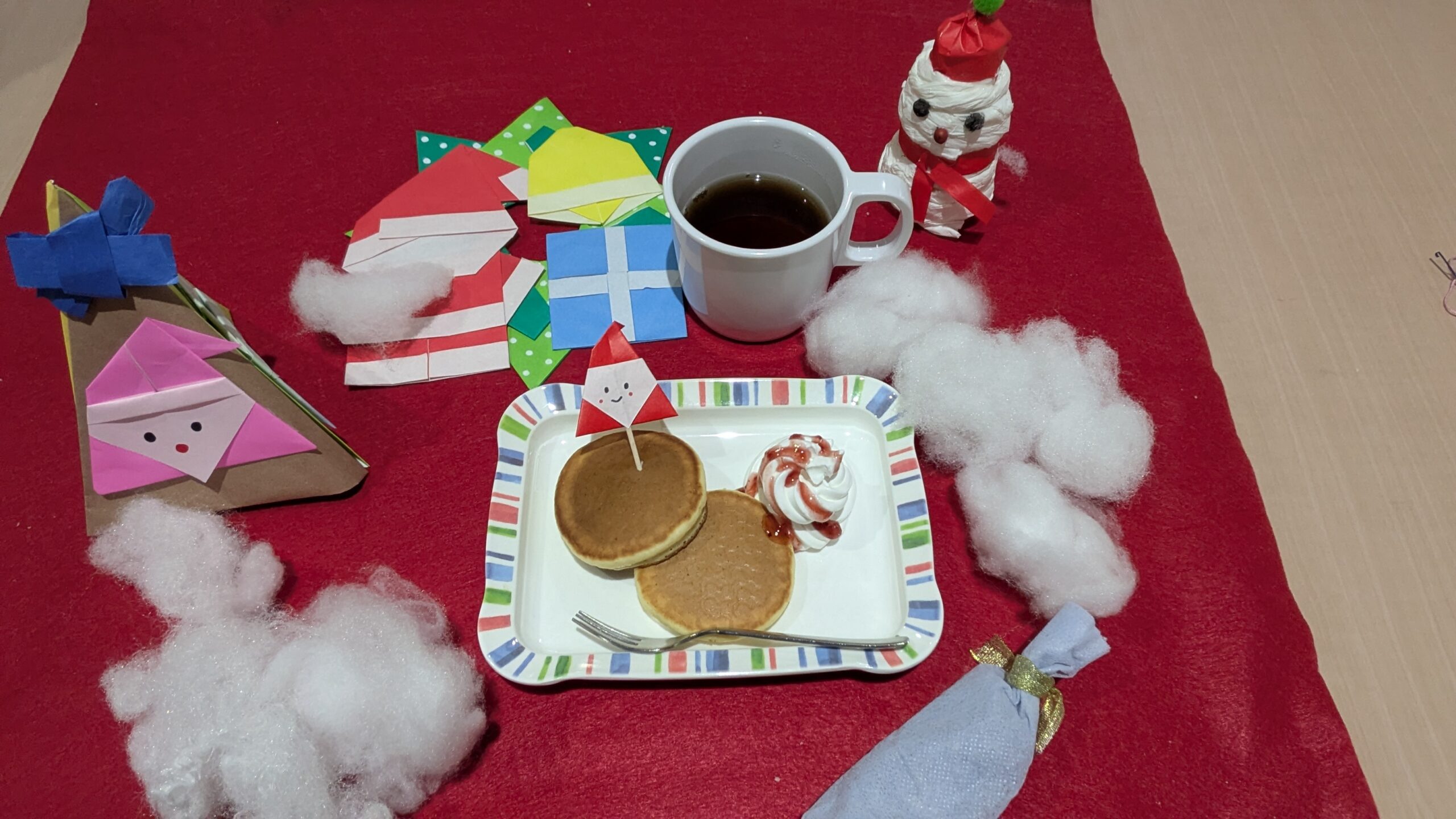 今月はクリスマスということで、職員手作りのパンケーキをホイップクリームとイチゴソースで召し上がっていただきました。かわいいサンタさんがデコレーションされていますね♪