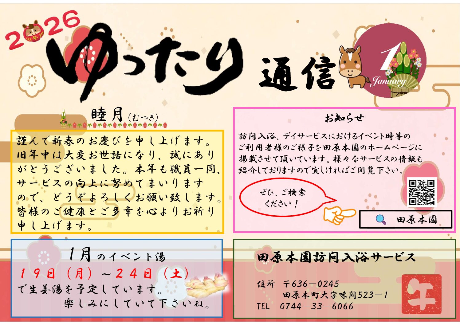12月 31 2025 令和8年1月 ぬくもりの郷デイサービスセンター広報誌「ぬくもり通信1月号」です ❸トップページ(ぬくもりの郷), ❹ケアマネージャーの方へ(ぬくもりの郷), ぬくもりの郷_デイサービス