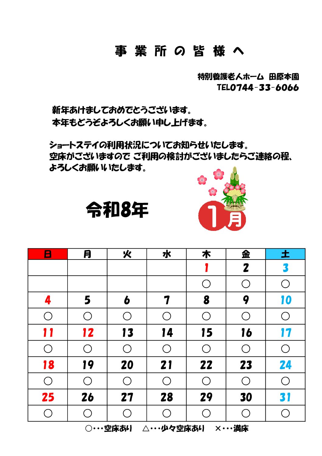 4. 令和8年1月分 ショートステイ空き状況です ~特別養護老人ホーム田原本園ショートステイ~