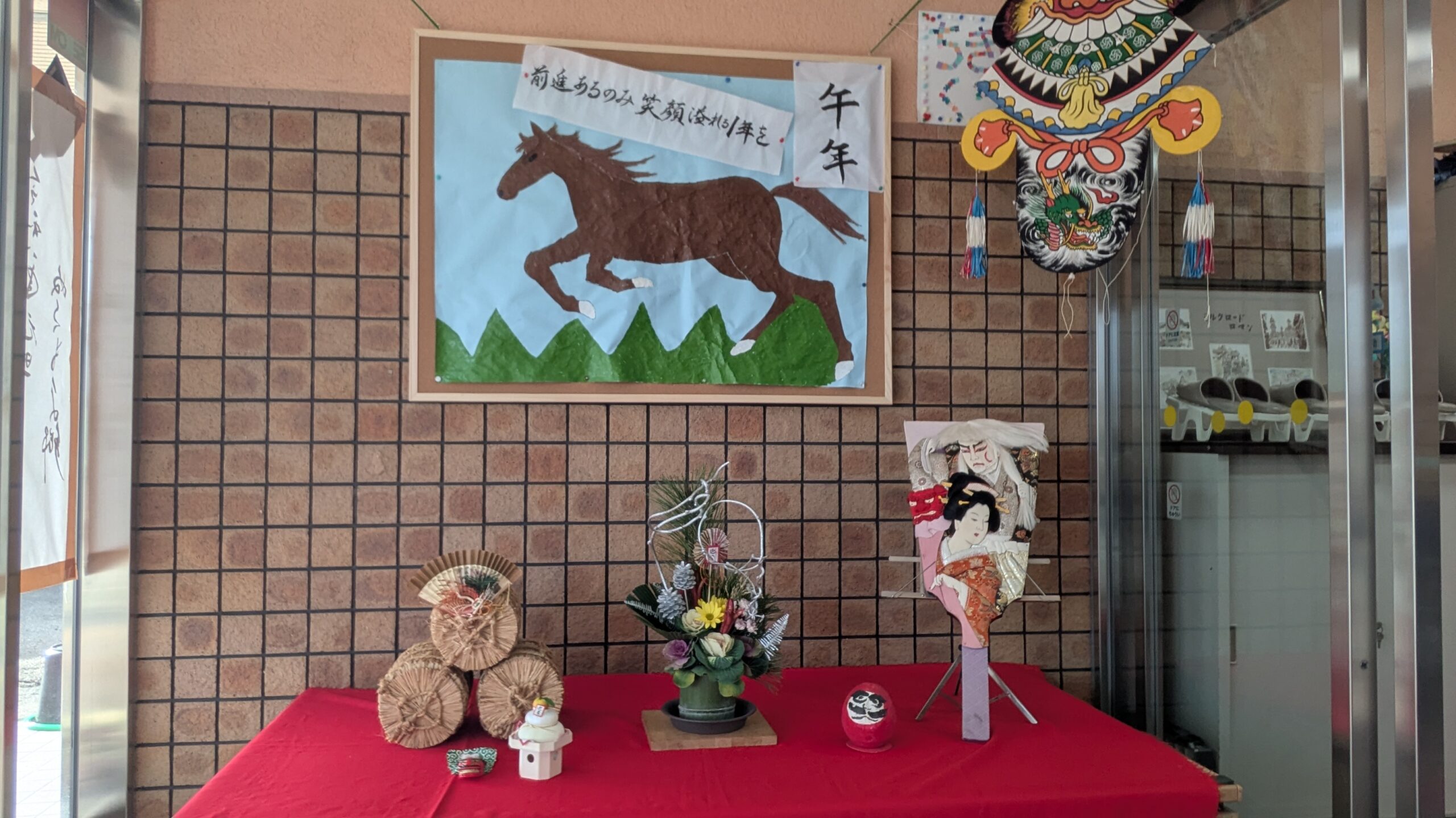 玄関では今年の干支の午がお出迎え。(午=利用者様作)
